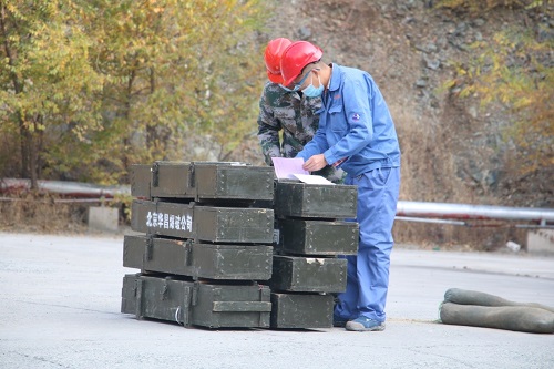 确认签字完毕后北京华昌爆破公司工作人员进行爆炸物品卸货工作。