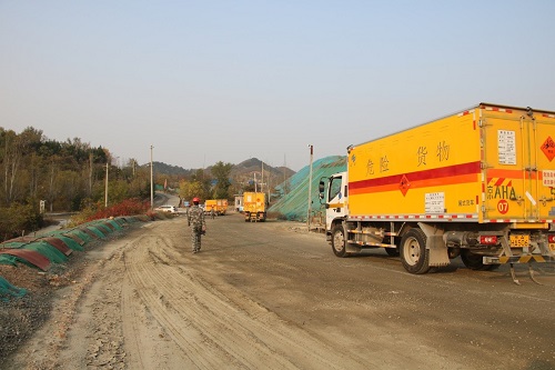 爆炸物品销毁工作结束后北京鑫运昌民用爆破器材有限公司运输车队准备撤离销毁现场。