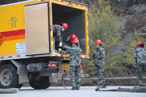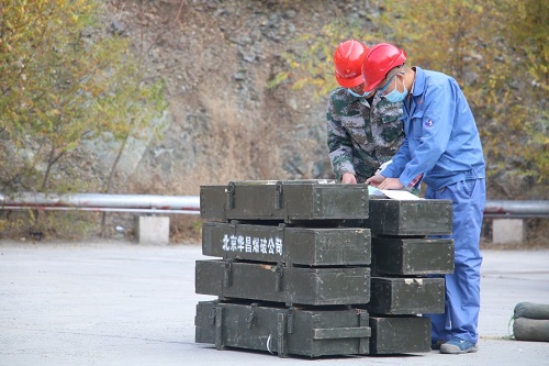 确认签字完毕后北京华昌爆破公司工作人员进行爆炸物品卸货工作。